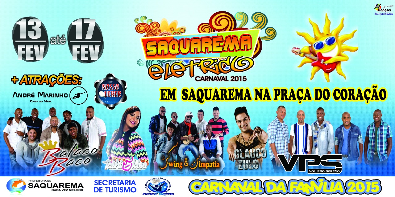 Quem achou que do Carnaval da Família 2015 não seria animado, se enganou! A Prefeitura de Saquarema, através da Secretaria de Turismo, trabalhou bastante e vai trazer atrações que irão eletrizar o carnaval. Acontecerão eventos em Bacaxá, Saquarema, Basileia, Boqueirão, Vilatur e Jaconé. Ao todo, 12 atrações irão agitar os cinco dias de folia!